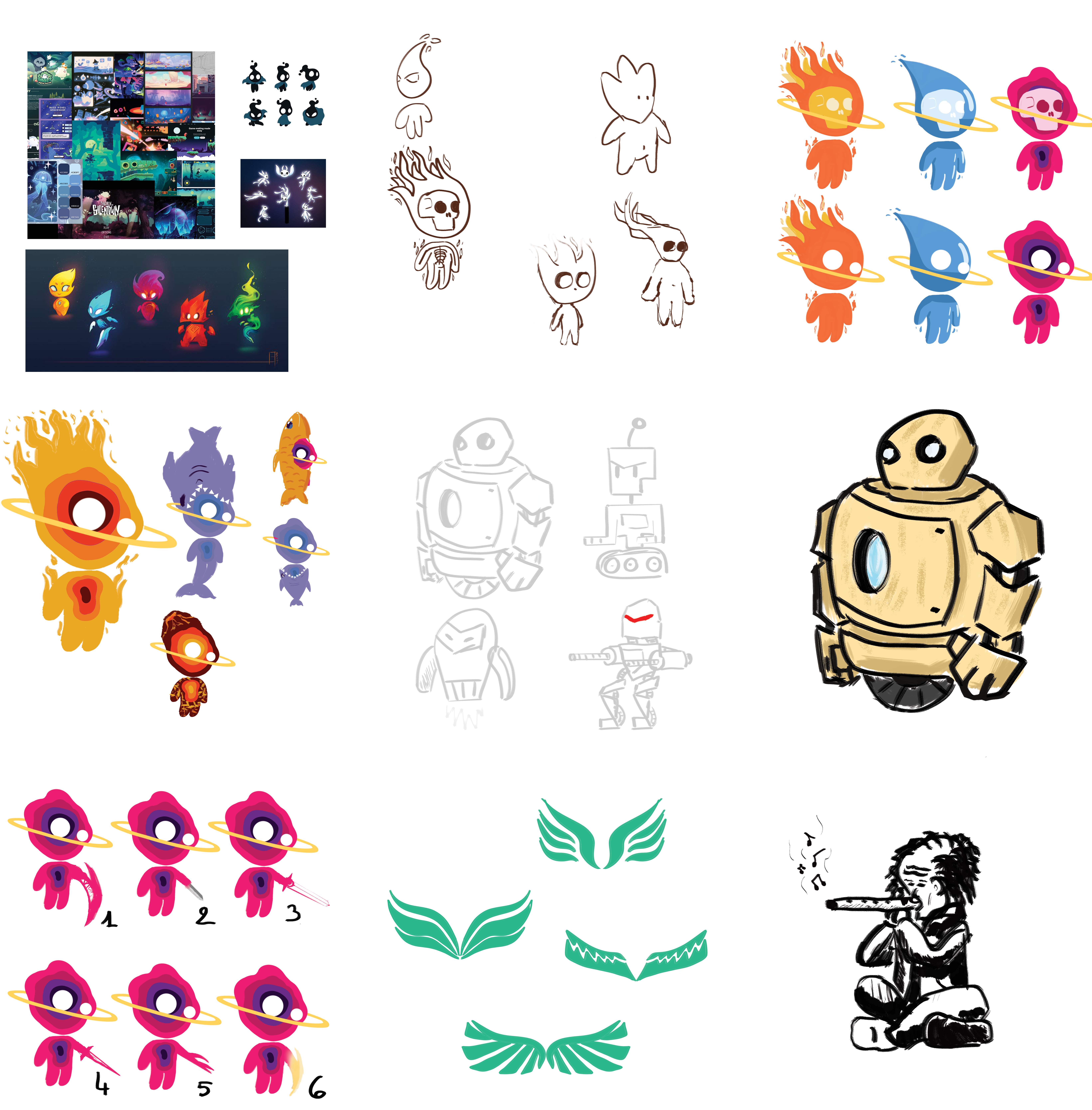 J'ai eu pour missions, en tant que designer, de créer les personnages du jeu dans toutes leurs formes ainsi que les cristaux élémentaires. Pour chaque élément, je l'ai d'abord dessiné à l'aide d'une tablette graphique, tout en proposant plusieurs versions au groupe, avant de vectoriser la version choisie sur Illsutrator. En fin de projet, j'ai également réalisé quelques fonds et animations pour le trailer du jeu.
